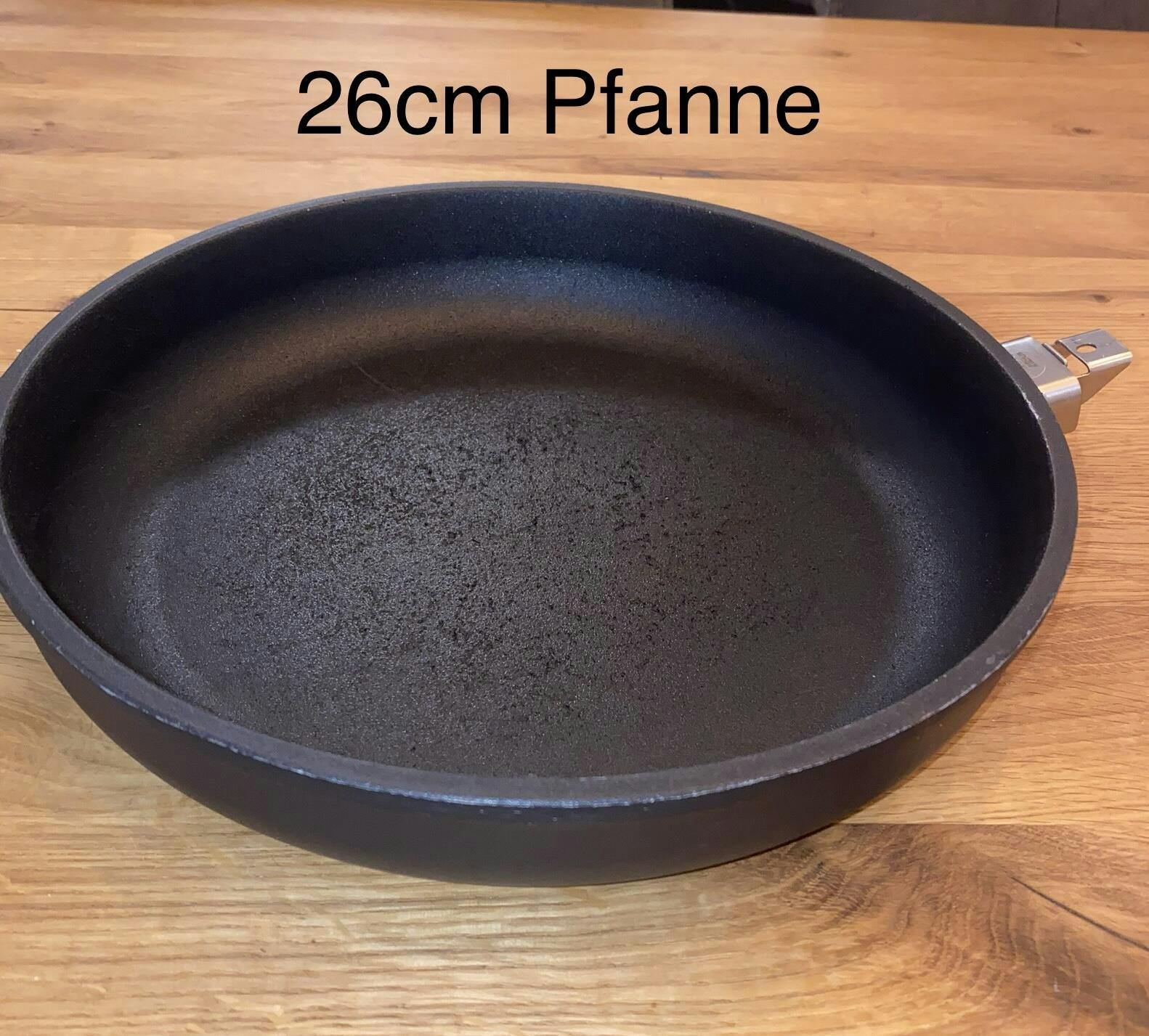 bestellt. Mir gefällt sehr, dass sie einen hohen Rand hat, sodass man darin auch gut Schmorgerichte, wie Gulasch, zubereiten kann. Toll, dass der Griff abnehmbar ist, was sehr hilfreich beim Reinigen der Pfanne ist. Es brennt nichts an oder bleibt am Pfannenboden kleben. Da ich begeistert von der Pfanne bin, habe ich auch noch die kleine Pfanne mit 20 cm Durchmesser bestellt. Die dazugehörigen Glasdeckel sind auch von sehr guter Qualität.