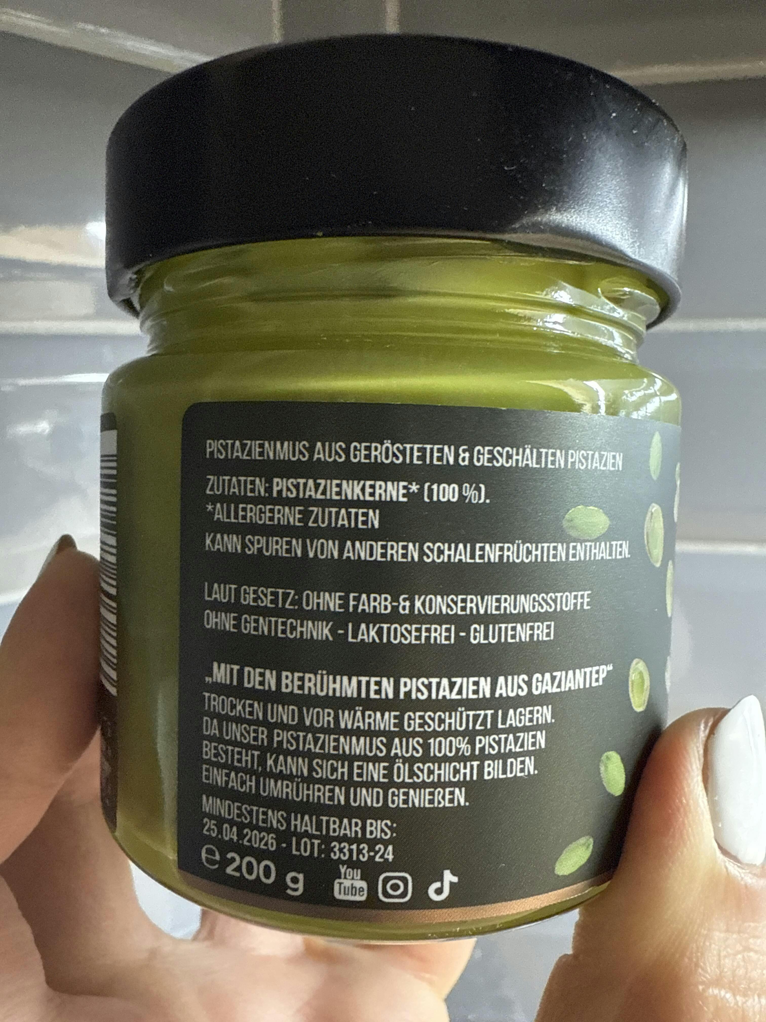 „Da unsere Creme einen hohen Pistazienanteil hat kann sich eine Ölschicht bilden. Einfach umrühren und genießen.“